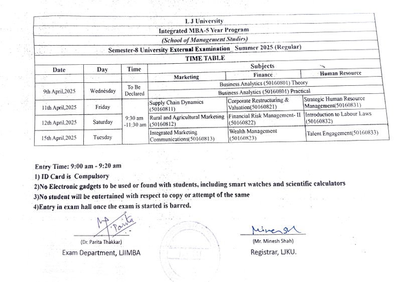 Semester 9 University Winter 2025 Examination (External Regular) Time Table