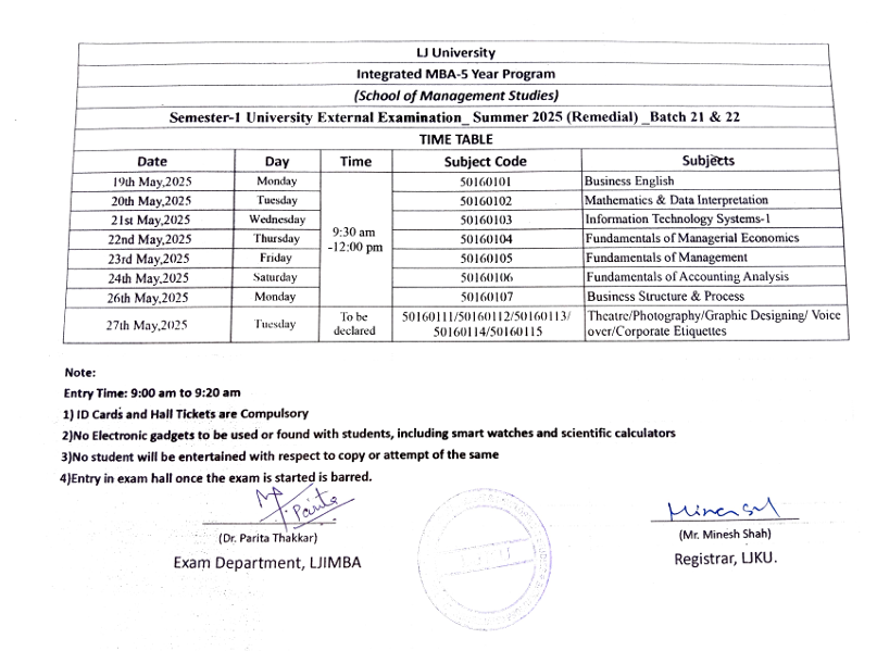07.04.25: Semester 1 batch(23&24) University Summer 2025 Examination (External Remidial) Time Table