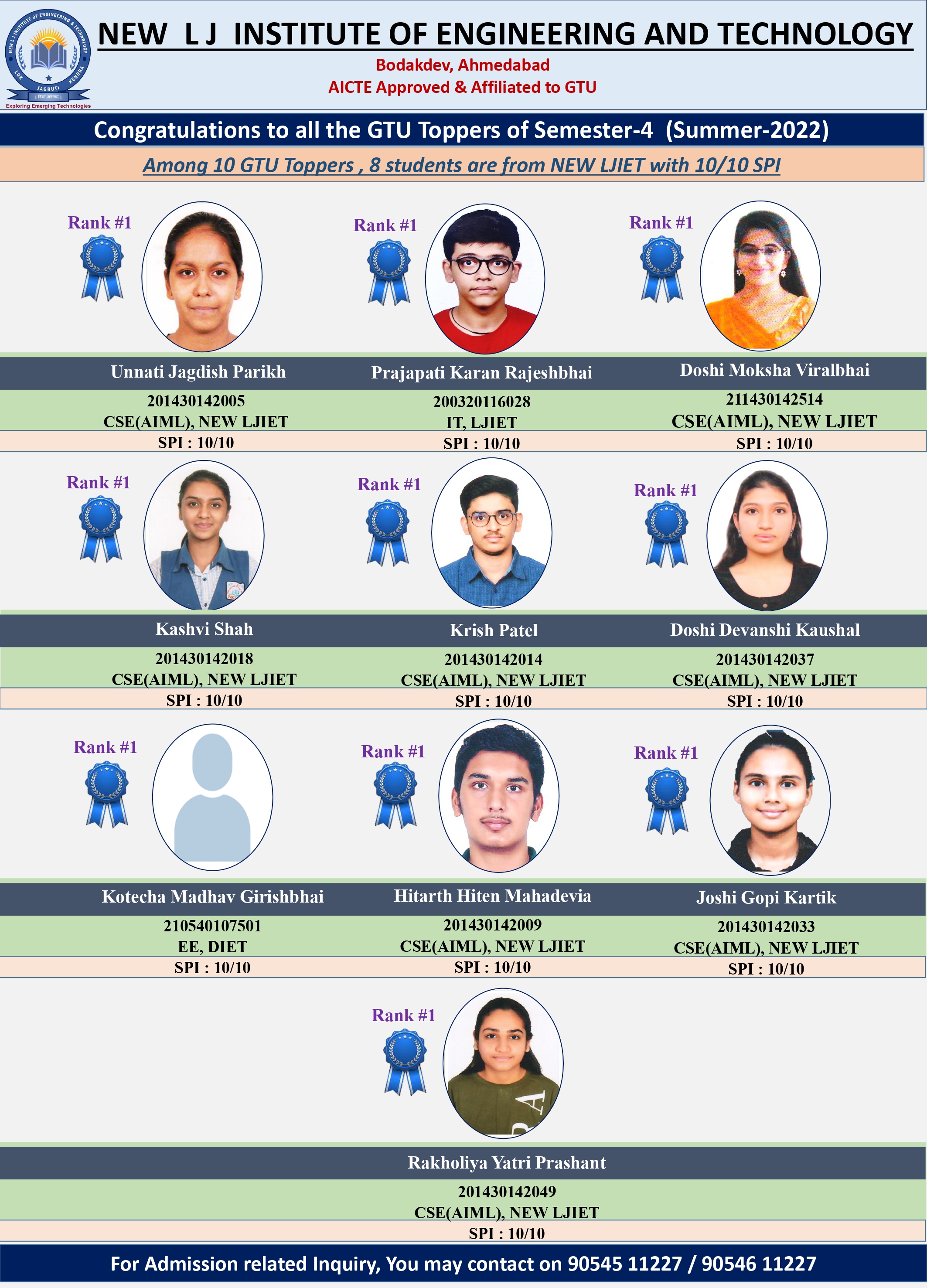 Among 15 GTU Toppers, 11 students from NLJIET have secured 10/10 SPI in GTU Semester-1 Exam that was held in Winter 2021.